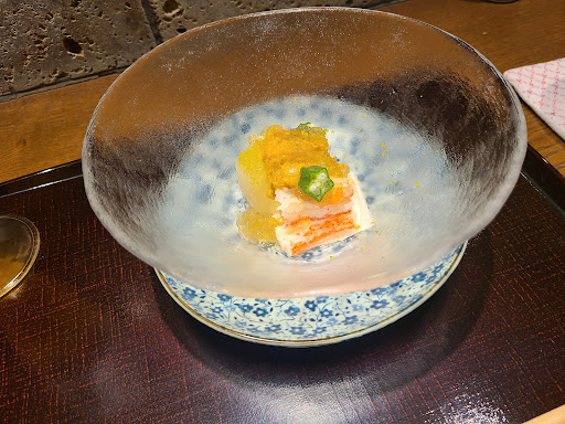 2024.12.25 北海道帰省前に行きました。 今回は仕事終わってから移動を伝えたところ7700円のコースは薦めていただきました。 予約の時には品数を伝えられていたんですが訪問時にはど忘れ。 確か8品だったと思います。 どれもおいしいのですが今回、特においしかったのはあんこうの友酢、自家製からすみ(初めて食べました)