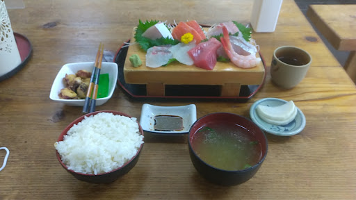 海鮮丼か刺身定食の二択の雰囲気。刺身定食注文し、10分程で提供。席は相席あり。粗く削り出しのテーブルと椅子、かなり時を経たコンクリ打ちっぱ的な室内で、インテリアセンスは気にして無さそう。着座して提供される茶は茶碗が幼児用で明らかに少ない。かつ、ホールスタッフが少ないのにテーブル上のポットなどセルフスタイルではないので食事前に飲み干したら後が困る。
