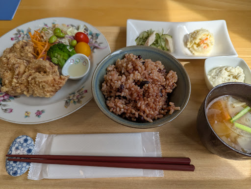 塩こうじザンギセット ケーキセット(おからケーキ、おからのガトーショコラ、函館美鈴アイスコーヒー) こんなに美味しい定食屋さんが、家の近くにあるなんて、ノーマークでした。福祉施設関連の飲食店のようです。 食材にこだわって、すごーく優しい味付けです。手作りの豆腐も美味しかったし、オプションで変更した玄米の味が忘れられないくらい。ザンギも柔らかかった。3つでは足りないけど、こういう定食は味わって、よく噛んで、ゆっくり食べちゃうから、満足でした。 デザートのケーキもまた優しい甘さで、どちらもしっとりしてて、美味でした。 他にもメニューは色々あるから次が楽しみです。常連さんが多くいる良店なので、健...
