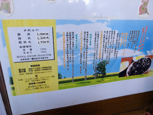 Read moreぶた丼は ばんちょう を代表とする厚切り炭火焼き(フライパン焼きも含む)のスタンダードスタイルと前橋や此処 鶴橋の薄切りフライパン真っ黒ぶた丼の2極存在する。 一時は更に 卵とじぶた丼(柏林台駅付近にあったが閉業) 塩ダレぶた丼(とかちっこ 現在閉業) 甘味噌ぶた丼(十勝清水の古母里で昔提供していた) と瞑想した時期もあったが現在はこの2派に戻った。 味は完全に好みが別れる所 おしゃべりなマスターのお店。