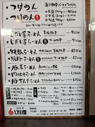 たまたま近所にいたので、昼食で利用。 駐車場は4台分くらいのスペース、大型車だけだと3台くらいしか停められないかも。 GoogleMAPの評価が良かったがちゃんと確認せずに入ったため、何がおすすめか分からない😅 メニューの先頭に載っていたのと、チラッと見たら既に食べている客が食べている物もそうだったのでつけめんを注文。 つけめん赤に、ゆで卵をトッピング。 出てきた麺は思った以上に滑らかだけど、コシがある。つけダレはかなりとろみが強い魚介出汁系で、味は濃いめ。(北海道的には濃いめは標準?) 麺の器にはメンマ、茹でたもやし、海苔、トッピングしたゆで卵か乗っていて、つけダレには厚切りの柔らかく煮て炙ったチャーシューが入っていた。 おすすめに書いてあったので、山椒をつけダレにかけて、食べてみた。 味ははっきりした感じで旨い! 旨いけど、頻繁に食べるもんじゃない。 この旨味に慣れると味覚が壊れそう。 あっという間に麺はなくなった。 そのくらい美味かった。 割スープを頼むと、小さなカップにスープが出てくる。 スープを入れようとしたら、白濁している。 メニューを改めて見て解った。 ラーメン用のスープを割スープとして出してくれているのだろう。(推測、次回はラーメンを食べるぞ!) 濃厚豚骨スープで、つけダレに割スープを入れるとやっぱり濃厚なスープの飲み物になる。 旨いけど、このまま麺を入れても、ライス...