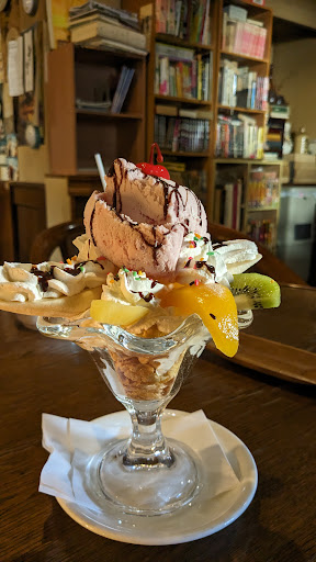 パフェはすごい量で丁寧に作られてて、乗ってる果物も2個づつ入ってて、2人で分けて食べたらちょうどよかった。底の方は甘いコーンフレークがたっぷり。真ん中にバニラアイス、上にいちごアイス、クリームたっぷりチョコスプレーが懐かしい味。チョコソースもかかっててバナナとの相性最高!!