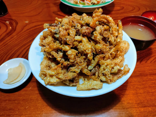 とんかつの見た目は大きいものの、肉はペラペラに薄く脂身ばかりで、ひどく固い。エビフライも同様に見た目は立派だが、中は極細のエビで、実体はほとんどが分厚い衣。専門外の食材だからでしょうか?