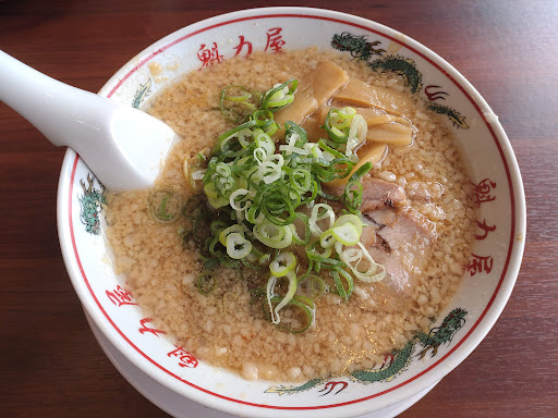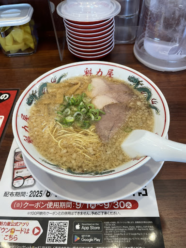 Read more一番の定番ラーメン、京都背脂醤油ラーメンを頂きました。来来亭を思わせるラーメンで麺は博多ラーメンのような極細麺です。 しかし、博多ラーメン以上にのびるのが早く、麺の固さを固めで注文しても後半はかなりやわらかくなります。 醤油は少し醤油自体が主張しすぎな感はあります。京都で有名な第一旭と同じような感じで、個人的には醤油が主張しすぎない醤油ラーメンが好きですが、ここ魁力屋さんの味も悪くないです。 醤油が主張しすぎな感を除けば結構美味しいと思いました。