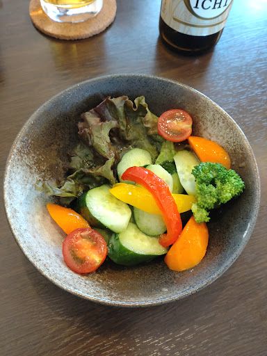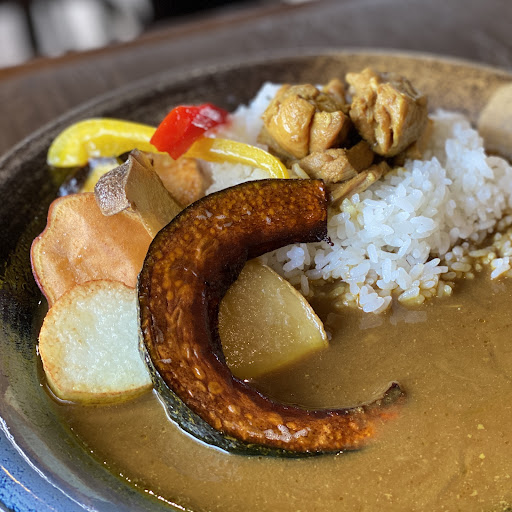 Read more小布施町の住宅地奥の飲食店 ■2024.10.23 ・小布施蔵カレー ・漬けサーモンのサラダ Google先生で偶然目にしたお店を訪問してみました。 住宅地ど真ん中の奥まった場所に、お洒落なバー的な趣きのお店があります。 夏の観光期が過ぎた雨降りの夜ということもあり、店内は静か。 今回は、メニューで目に付いたカレーと、漬けサーモンのサラダを注文しました。 まず、サラダはバルサミコの味付けが爽やかで、パプリカなどの野菜の彩りが鮮やか。 健康配慮で注文しましたが、予想外に見た目が美しく、美味しいサラダでした。 次に、カレーはタイミングを見計らって提供。 カボチャ、ジャガイモ、長芋、丸ナス、エリンギ、ニンジン、パプリカの素揚げ野菜が乗ったスープカレー。 素揚げは季節によって変わるのかな? ほっこりしつつも、ピリッと辛い旨いカレーでした。 ちなみにコチラ、ドリンクメニューの記載が多く、ワイン、クラフトビール、日本酒の品揃えも良さそうです。 場所柄、コチラで呑めそうにないだけに、それが残念で心...