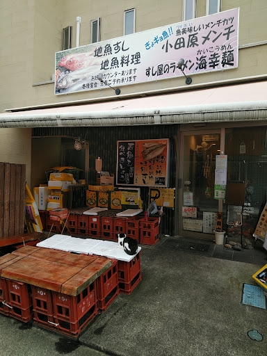 Read more4連休の午後1時頃、海鮮丼を求めて、早川港へ来るがもの凄い混雑!まず駐車するのに、15分以上かかりました。同行している家族を途中下ろして“海鮮丼のおいしそうな店ならどこでも良いから選んで入店して”として先にお店選びをしてもらうがメインストリートの人気店は行列ができていて、幾つか名前を書いてまってみたものの、なかなか順番が回ってきません。程なく私も駐車でき合流。家族から状況を聞き“脇道の所にお店があるり気にはなっている”というので行ってみると“海鮮丼あり・この店だけ食べれる地の物あり”と店頭看板に表示があり、お店の方に話をきくと“ちょっど今何組か出て、片付ければ案内できる”との解答に“決定”家族全員で名前を書いて順番待ちを全て消し戻ってくるとちょうご案内・2階座敷席に入れました。2階はテーブル2つⅹ4名席・靴を脱いでの掘りごたつ式と、テーブル2つ×4名席・靴のまま いす席風(くふうしてあります)。2階へは階段とエレベーターとがあります。コロナ対応としては、入口にアルコール剤の他、2階席半分ずつ交互使う?・窓開け換気をしていました。メニュー説明は店員さんがお茶を配る時点で詳しくしてくれるので、その説明を聞きながら、家族はメニュー選択ができたようです。セットは概ね1760円のようで量は同じようです。色々なものが付いたものを選ぶか・一点豪華でいくか・ひとつの食材を色々な調理法で食べるか・お店のお薦めを食べるか。私は鯵の定食を食べました。お造り・ちらし寿司(つきだしのサラダも)美味しいものでした。ただ鯵フライは揚げたてでなかったせいか油が重く、他に比べて残念なものに感じました。食べ終えてお店を出ると二匹の猫がお見送りをしてくれました。(本当は餌の時間のようで私に...