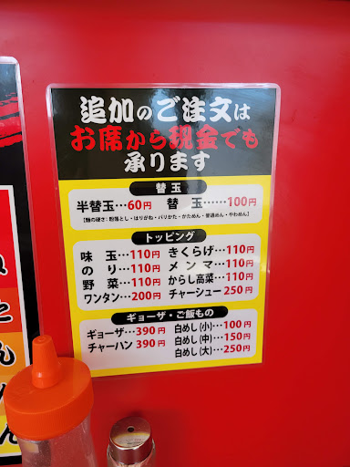 業務スーパーの交差点を左折で入って左側にまる星商店さんはあります。 店舗手前に大きな駐車場があって15台❔くらい❔は停められそうです。 なお、駐車場と店舗の間には道路があるので渡るときは注意です❗ 店舗入って左側に券売機と冷水機。右側にも冷水機だけ設置されてます。 食券買って席についてから券を渡すスタイルですかね、、、 カウンターがちょっと高めのカウンターなので色々と注意が必要です。 とんこつラーメンを普通でお願いしました~。 10分かからずに着丼❗ 博多で食べてたとんこつラーメンと見た目は同じです。 気になったのは匂い、、、 「うま臭っ❗」良い意味で癖のある匂いを感じてスープ飲んだらやっぱり臭ウマでした❗ 関東圏で食べるとんこつラーメンはここの部分をライトにして万人受けする感じにしてますがまる星商店さんは少しだけ出てる感じでした。←ちなみに、自分は全くの素人なのでその時に感じた事を書いてます。味覚何か人それぞれ違うし美味しさの好みもバラバラですからね。 で、確か、特製濃厚どとんこつ❔ってメニューもあったと思うので「臭ウマ同好会」の人は食べてみてください。 美味しかったです❗ご馳走さまでした❗ で、ラーメン屋さんで食べ終わるとちょい上カウンターに丼ぶり戻して軽く布巾でカウンター拭きますよね❔さっきも言いましたがまる星商店さんはちょい上カウンターが高いので迷惑かな❔って思い先客さんの帰りを見てたら皆さんそのままカウンターに置いてあって、、、 そーいえばカウンターなのにお店の方も厨房から出てきて提供してくれてます。 なので、「そのままですみません。」と言いつつカウンターに置いたままにしちゃいました。 どっちが良いのか、、、まる星商店さ...