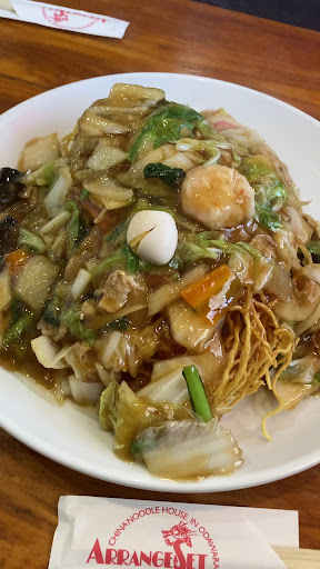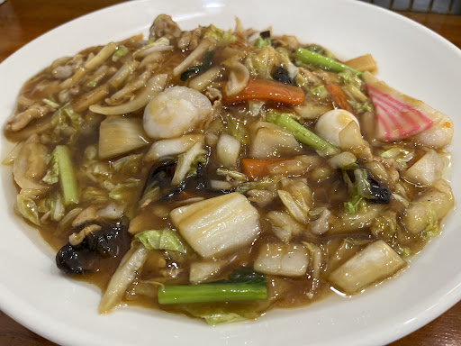 2024.8.17 かれこれ30年ほど前に川向こうでひとり暮らしをしていた頃、わたしは当屋の評判を仕事仲間たちからあれこれ聞かされていたが、訪ねる機会を失しながら立派に齢をとってしまったw。(-いうまでもなく小田原大橋の出現前と後では、酒匂川の左岸と右岸を往来する我々にはそのメンタリティにおいてじつに大きな抵抗感があった。"寿町からめしを食いにちょっと南鴨宮や酒匂に"という衝動はきっと現在ほど安直に実現しづらかったのである) そんなわけできょうの昼、家内を連れて30年越しの念願叶い当屋初訪店なった。家内はなにも予習wせずに八宝かたやきそばを注文。到着した皿の状況を見てその大盛振りに目を白黒させているwww。スタッフの女性が前もって用意してくれた小皿でわたしは家内を手伝ってこの巨大なかたやきそば山脈wの突き崩しに掛かる。大好きな酢と辛子をしっかりまぶしてこれを頬張れば…umm.旨い。具材たっぷりの熱々瀞み餡が絶妙な旨味を齎す。volumeもさることながら味も抜群のかたやきそば。当屋人気No,1...
