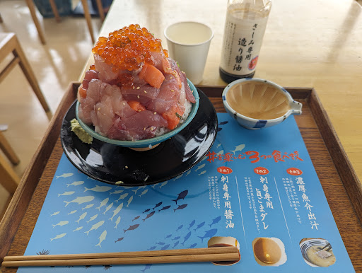 This is one of the restaurants in the food court on the second floor of "Fishing Port Station TOTOCO Odawara". There is an Italian restaurant on the same floor, but it is no exaggeration to say that almost all the users of this food court use this restaurant. It's a popular restaurant with a long line of customers on weekdays and holidays, and the line even extends to the first floor of the building via the stairs. However, the line almost always dies down by 3:00 p.m., when lunchtime is over. You must purchase a meal ticket in advance from the ticket vending machine located near the entrance of the food court. The menu is extremely varied, and is written in English as well as Japanese, making it easy for foreign tourists to use. Payment methods include cash, credit cards, and electronic money such as transportation system IC. When the number on your meal ticket is called out over the in-room announcement (the number is also displayed on the dedicated monitor), you will receive the food you ordered at the pickup counter. After eating, return the tablewares to the return counter. The restaurant's signature dish is the Kaisen-don (seafood bowl), a bowl of rice topped with as much sashimi as possible. No matter how you eat it, the sashimi is almost guaranteed to spill out of the bowl, so the bowl is always covered with a large plate to catch it. Although it looks very impressive, the bowl itself is about the size of an ordinary bowl, so you may feel that the serving size is smaller than you expected (and that it is a bit expensive compared to the amount served). However, the sashimi is still packed so tightly together that you will feel full...