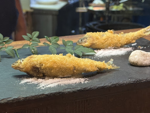 鮎のフライ、夏野菜の天ぷら、ひな鳥の焼き鳥、ひな鳥の唐揚げ、イカソーメン、ご飯をいただきました。おすすめは...全部です。 鯵や鰹などほかの海鮮系や、山菜系のメニューも美味しそうでした。