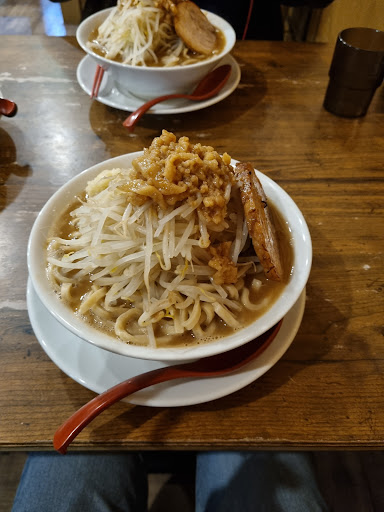 大350g、中250g、小150gといった展開から食券を購入し、お好み(コール)を食券と共に伝えるオペレーションです。 肝心のラーメンはまずまずの出来だと思います。麺はやや平打ちストレート太麺で角張ったタイプで、硬めコールせずともアルデンテな噛み応えがあります。スープは乳化タイプで以前提供していたとんこつラーメンの濃度感を感じました。ただし以前までの無化調にこだわる形ではなくかなり化調感を感じます。卓上にもあるカエシがかなり独特でソースのような粘度と風味があります。野菜はシャキシャキで量はほどほど、炙られたバラの豚はかなり柔らかいですがかなり脂っぽいので賛否が分かれそうですね。 中を食べましたが丼もあまり大きくなく、普通の食事として成立する程度のちょうど良い満たされ具合でした。ハードコアな「二郎系は満腹まで追い込む」という概念ではなく、より一般大衆的にはちょうど良いです。