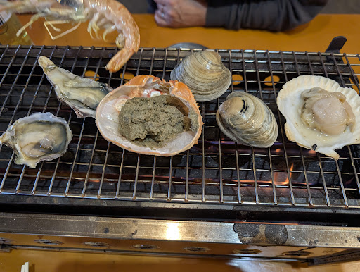 浜焼きが食べたくて県内(秦野市)から伺いました。 浜焼のBセット(2950円)は、ホタテx1、はまぐりx3、エビx2,牡蠣x2(元々はサザエだったようですがサザエのサイズが小さいとのことで牡蠣でした)、蟹味噌x1、アワビx1、アジの開きというラインナップ。 ごはんとみそ汁とお漬物が付いてました。 アワビは活きが良くとても柔らかくて美味しかったですし、アジの開きはすぐに厨房で丁寧に焼いてくれるのがちょっと嬉しかったです。 他の具材も鮮度も良く臭みもなく美味しくいただけました。 牡蠣のみちょっとサイズが小ぶりでしたがもしかしたら季節的なこところもあるのかもです。