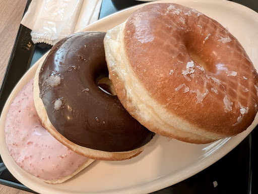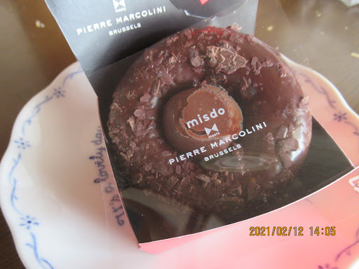 2021.02.12(金) 買い物を終えてお店の前を通りすがりに店内を覗くと、「あっ!!」と思わず声が出てしまいました。 あの「ピエール マルコリーニ コレクション」があるではないですか。!! 自宅近くのお店では「数量限定10個」なので購入することが出来ず諦めていたんです。 それが沢山陳列されているんです。 思わず店内に。。。「これ、全種類ください。!!」(笑) やっと6種類購入することが出来ました。 ベースのドーナツは2種類でトッピングの変化で味わいが変わりとても味わい深く美味しいです。 今までにない食感が楽しいです。 *フォンダンショコラドーナツ ショコラ (税抜)¥200 (税込)テイクアウト ¥216 (税込)イートイン ¥220