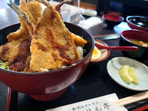 Read more男鹿にある和風レストラン。男鹿グルメとして、男鹿しょっつる焼きそばと、ハタハタタルタル丼と、ホルモン煮込みをいただきました。 しょっつる焼きそばは通常と違い、あんかけ堅焼きそば。味変にレモンと辛みオイル(ガーリック入り)、しょっつるスプレーが付属してます。 生麺を少し揚げたような麺に、しょっつる味の餡がよく絡み、すするごとに少し柔らかくなって来てる麺と餡の風味が口に広がって旨い。 揚げた生麺が餡で少し柔らかくなっているのが、沸騰してないお湯を入れて作った即席麺ににてる。 味変に、辛みオイルをかけレモンを搾ると、魚醤+トウガラシ+ガーリック+酸味+シーフードで、トムヤムクン味に変化。 そのままでも美味しかったですが、またガラッと変わってこれも旨い。 ハタハタタルタル丼は、タルタルを自分で作るようになってて、ゆで卵を自分の好みの粗さが調整できる。 ハタハタはもともと身が薄いが、キレイに開いて揚げられてて、サクサクした食感に、ハタハタの旨みとソースとタルタルが一体になってごくじなお味。キャベツが乗ったご飯が進む。 道の駅はちもりで食べたハタハタ丼は、身がハタハタとは思えないけど肉厚でふっくらしてて最高に旨かったけど、こちらはこちらで食感が良くて旨い。タルタルソースもよい。 ホルモン煮込みは安定の旨さ。とろける煮込み具合でした。 ここは当たりでした。また男鹿に...