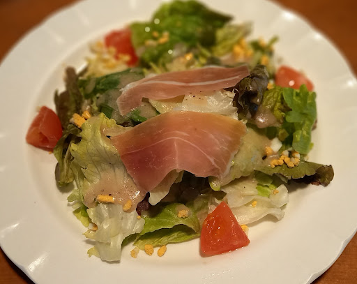 メニューは壁にかけてあるAランチorBランチor定食 のどれかになります。私はAランチを注文しました。サラダは生ハムのサラダ、メインはハンバーグステーキ、パンかライスどちらか選べます。 あとデザートとドリンク付きで1300円です🙂
