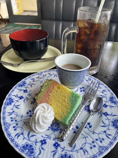 おにぎりモーニングが完売と伺い、 シフォンケーキのモーニングをオーダー。それにうどんと紅茶のババロアが付いてくる。