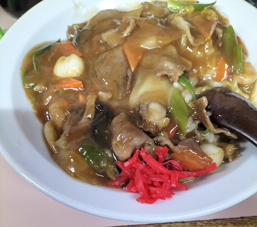 同行者の注文した 天上飯も、上に乗っている玉子自体は フワトロな美味しいものでしたが、下のご飯は甘くて濃くて、後から辛さがジンジン来ると言う かなりインパクトのある料理だったとの事です。。。 ただ、ランチセットで付いてきたミニ醤油ラーメンは、コクがあって、まるで味噌ラーメンのような風味の、複雑で独特の美味しさだったそう