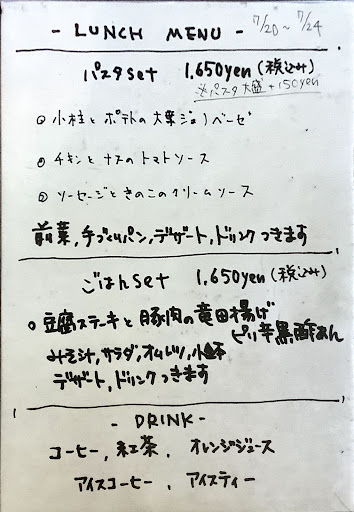 Read moreパスタランチを食べました。デザートも付いてきて、爽やかなゼリーとふわふわのシフォンケーキがおいしかったです。 ただ、お店の至る所に「お席のご利用は90分まで」と書いてあり落ち着きません。 常に圧を感じます(^^;; いわゆる喫茶店などで本を読みながらコーヒーを楽しむ、のようなことは不可能です。 私が伺った際は店内は空いており、デザートを食べる頃には私ともう一組でしたが、しっかり伝票にはPM2:00までの利用〜と書いてありました。ここまで徹底しているのも珍しいですよね。 あと、お皿を下げる時に背後から無言で来られたので少しびっくりしました。(キッチン?のスタッフさん)