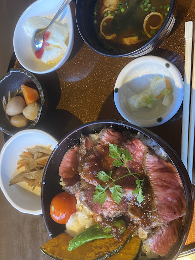 私はステーキ丼ランチをいただきました。ステーキは和牛の赤身なので筋はなく、柔らかくて美味しいです。ただ、私も息子も主人も思ったことですが、マッシュポテトがご飯の上に乗ってるのと、肉汁でご飯が赤っぽくなっているのが苦手・・・。レタス1枚敷いてそこにステーキを乗せて欲しかった。でも、ご飯は真っ白ツヤツヤだったし、全般的に美味しく、大満足でした。 父の刺身ももらいましたが、脂が乗っていて新鮮で美味しかったです。父も美味しいと言っていました。 母は焼き魚でしたが、「味噌汁が濃く、ちょっと冷めていたのがすごく残念だった。あとは全部美味しくてすごく良かったのに、味噌汁だけがほんとに残念・・・。それを除けば満点💯ですごくよかったのに。」と。確かに私もお味噌汁の濃さは気になりました。時間が遅めだったから、煮詰まっちゃったかな?