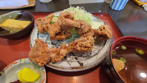 ここは定食屋さんのようで、たまたま見つけたお店です👀✨他の方の口コミがあってほんとに良かった!知る人ぞ知る名店という感じです🙋♀️‼️ 唐揚げ定食が有名だったので、行く時は絶対それにするぞ!と心に決めていました‼️ 一緒に行った恋人は、おろしヒレカツを注文! お店のメニューや至る所に時間がかかると書いてありましたので、気長にお話しながら待っていました!そこまで待ったという感覚はなく、孤独のグルメをテレビで観ていたため案外早く到着📺✨すると山盛りの唐揚げが!🤩7個も乗っていました🤍キャベツにはゴマどれが!キュウリミニトマト🍅🥒唐揚げにはお塩とレモン🍋マヨネーズを付けて食べられるようになっています!赤だしも手作りのようで具だくさん!心が温まる優しい味です🐟ご飯は大盛り無料のクチコミを参考にし、初めにお願いしておきましたが、しておいて良かった😭⭐️漬物も着きます!そして定食には絶対着いてくるという出汁巻きたまご🥚メニューを見て、だし巻きだけ時間に余裕のある方と表記があったので、時間かかるのかな?とちょうど話していましたが、今日食べられるとは思ってなくてほんとに嬉しかった✨ほんとに何て言っていいかわからないですが、めちゃくちゃ美味しい!何のだしだろう?と考えましたが全く検討もつきません”🤷♀️゛ そして肝心の唐揚げは、下味がしっかり付けられていて、これだけでもご飯がススム味✨パリジュワで、お肉が全くパサパサになっていません🍖美味しすぎる😭ここでは唐揚げを食べた方がいいと皆さん書いておられますが、本当にその通りです!絶対食べてください!🙇 美味しすぎたので絶対また伺います!ご馳走でした🙏🏻🤍駐車場...