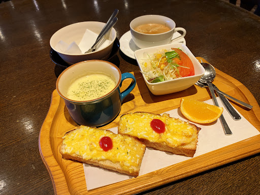 落ち着いた雰囲気で、ゆったりとした空間の素敵なお店でした。 今日は初めてモーニングに行きました!美味しそうなモーニングと安い価格に惹かれました。 私はスープモーニング(420円)でコーンスープを注文しました。食べた感想は美味しい!の一言です!食べ終わった感じ、妥当なお値段だなと感じました。そこまでボリューミーではないので、腹6〜7分目といったくらいで、お得感を感じるのはドリンクバーです!お子様にはいいかもしれませんね♪♪ 連れはフレンチトーストモーニング(520円)でハニーを注文していました。フレンチトーストとサラダだけなので、品数は少ないです。ヨーグルトでもつけて欲しいなぁ〜と少し思ってしまいました。笑 物足りなさを感じるかもしれませんが、フレンチトーストはとても美味しいです!器になっているスキレットで焼いているようで、焦げてはいませんが、スキレットにくっついてしまって、すごく柔らかいので、剥がす時にちょっとだけボロボロになってしまいました…( ˊᵕˋ...