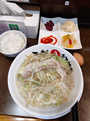 Read moreR6.3.23 朝ラー目当てで訪問しました。 このお店はモーニングサービスが有り、ライス1杯無料なのと、生タマゴ、しば漬け、ポテトサラダ、フルーツポンチ、ヨーグルトが1回だけ無料という、サービスが他店にない唯一のシステム。 専用トレーに盛りつけるわけですが、あくまでメインはラーメンなので、サイドメニューは欲を出さず食べきれる量にセーブしました。別途300円払えばおかわりはできるみたいです。 さて、ラーメンは朝ジローの麺200グラムをチョイス!ちと食べ過ぎかもと思いましたが、先ずは中間サイズで様子をみます。 程なくして着丼。うーん、見た目は通常位のサイズでこれなら行けそう! 肉も厚切りチャーシューじゃないので、アサッリしてそう。 スープの方は塩ベースで、朝にはもってこいです、麺は太麺なのですが、塩ベースのスープのおかげでそれほどこってりした感はありません。あっという間に食べてしまいました。ご飯ともスープがよく合うんですが、ご飯が最後の方に、女将さん?から、「このスープにご飯を入れて食べるとお茶漬けみたいで美味しいですよ」とのアドバイスをいただき、残りのご飯をスープに投入しました。うん!確かに美味しい!これは何杯でも食べれちゃう危険なコンボですよ。 とても美味しかったです。次回はご飯に手を付けず最後にスープヘ投入して食べてみたいですね。お茶漬けセットもあったので...