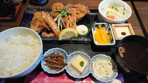 定食には、エビの唐揚げやサラダ・小鉢・デザートの枡プリンなども付いて、盛りだくさんです なおかつ、ご飯と赤だしのお味噌汁は、セルフサービスで おかわり自由なのも嬉しい!