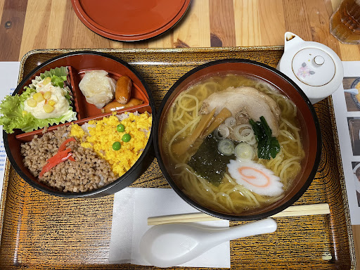 珍しい丼がドンと来た。何だこれと開けてみると丸型のお重の様になっていて、上がそぼろと卵のご飯もの、下が醤油ラーメンかな。 ソーセージやポテサラなども入ってる。 パリッとして美味しいミニソーセージだ。 そぼろご飯も文句はない。 ラーメンは見た目薄そうに見えるし、麺も丸中太麺のソフト麺みたいに見えるが食べた感じは悪くない。 というか、全体的な味のバランスで美味しく感じる。薄味の様で麺と合わせてしっかりしてるし、メンマも甘めの味付けされてて個々の味というより全体的な味で決めてる感じ。 そして水分が欲しくなるので、塩分高めなのでは無いかと思う。