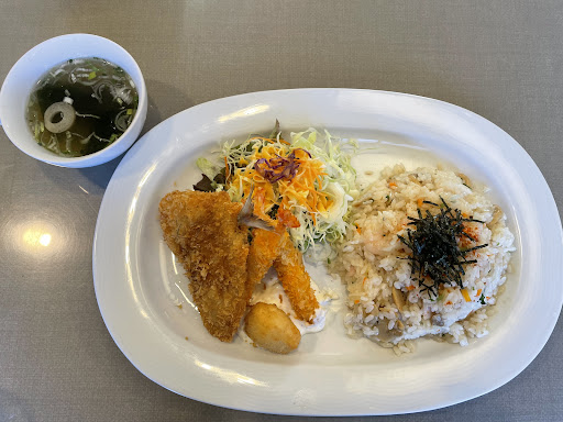 フライは、小さめなアジフライとこれまた小さめなエビフライ2尾、イカのフリッターで、下にタルタルソースが添えられています。アジフライには最初から醤油がかけられています。揚げたてで美味しいし、タルタルソースもいい感じですが、いかんせんサイズが小さくすぐに食べ終わってしまいます。もう少し大きいサイズがいいなぁと思います。 次にピラフですが、マッシュルーム、小エビも入ってバターの風味もしますが、少し塩っぱいかなぁと感じました。またピラフの上には刻み海苔がかけられていて、和洋折衷なように思いました。 スープはコショウの効いたワカメスープも少し塩っぱい。 食後にホットコーヒーも付いて950円なので、今のご時世を考えると妥当なところかもしれませんね。...