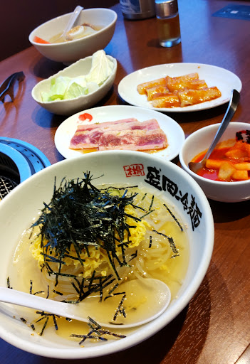 今日は、私が海苔冷麺、友人が盛岡冷麺 それに元気カルビ、イカ焼き、野菜焼きをいただきました。