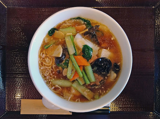小城市小城町畑田、佐賀県道44号線沿いにある中華系食堂です。やや小さめの店舗で、店内はテーブル席と小上がり席のみとなっています。駐車場スペースは店周囲の5〜6台分のみと少なめなのが難点ですね。さてラーメンですが、今回頂いたのは基本的な麺類メニューのひとつ「五目スープそば」です。優しく甘めの醤油系スープに、中細ストレート麺が用いられています。具はイカ、タケノコ、キクラゲ、人参、青梗菜、豚肉等が豪勢に盛られています。結構なボリュームで、最後まで熱々で頂けますね。大盛り対応なし、替え玉制なしとなっています。通常メニューでのその他の麺類は「タンタンメン」「えび塩スープそば」「マーボー豆腐スープそば」「あんかけ焼きそば」が用意されている他、季節限定麺類も用意されているので、選択の幅はかなり広いお店と言えます。因みに、今回は「チャーハン」のハーフサイズをお供に注文したのですが、通常サイズ並みの量で驚きました。全体的にボリューム満点のお店のようですね、嬉しい限りです。 2015年7月開業のこちらのお店、町中華として開店直後から客が押し寄せる地域の人気店となっています。特に「油淋鶏」が有名で、油断していると直ぐに品切れとなってしまう程です...