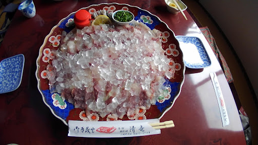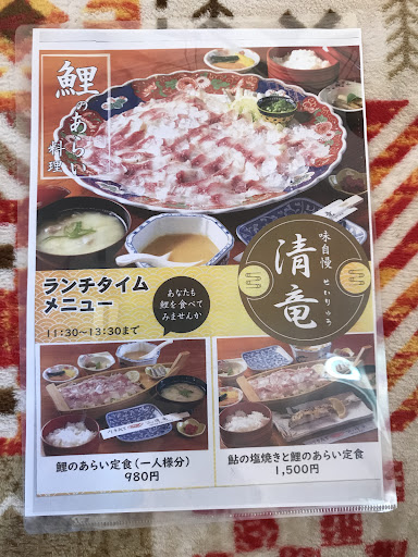 この界隈で老舗の店には普通なことですが、メニュー表はないです。 大人2人前で、丸い大皿に並べられた鯉の洗いとお鍋の鯉こく、そしておひつに入れられたご飯(小さい茶碗に軽く4杯分ほど)と小鉢とお漬物のセットが標準なので黙って座れば注文せずともこれらが出てきます。 普段はランチメニューがあるみたいで、入口前にリーズナブルな価格で写真が掲示されてますが、今回はお盆期間中でしたのでランチメニューはありませんでした。