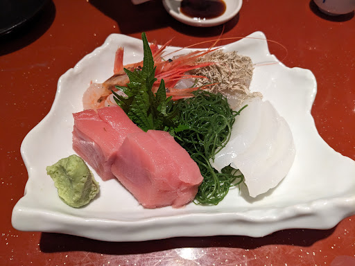 Read moreランチで来店。 メニューにランチの表記は無く、聞くと価格も内容も伝えられないまま注文が成立する。 先付、豆腐ステーキ、茶碗蒸し、揚げ物、寿司、刺身、うどんと盛りだくさん。 肝心の寿司は、作ってから時間がたっているみたで、大きめのシャリが冷たくガチガチ気味ということもあり、美味しいとは言いにくい。 茶碗蒸しはすが入っており、卵感は薄かった。