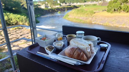 まだ新鮮な空気の中で川を眺めながら食べる朝ごはん