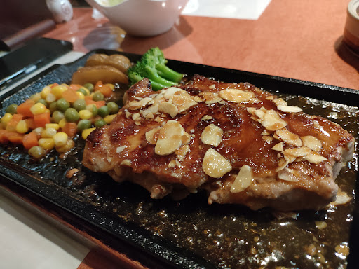 少し遅れてポークステーキが到着。鉄板の上に乗っていて、バチバチ油が跳ねます。特にエプロン等は用意されていないので、自己防衛が必要です。