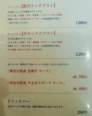 Read moreしゃぶ葉みたいなレストラン。ブッフェの料金は1680円。ドリンクバーが別料金で250円。 ・足柄牛モモ ・やまゆりポーク ・小田原漁港旬の魚 が1人1皿で、お惣菜、サラダ、ごはん、味噌汁、デザートは食べ放題。