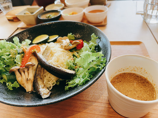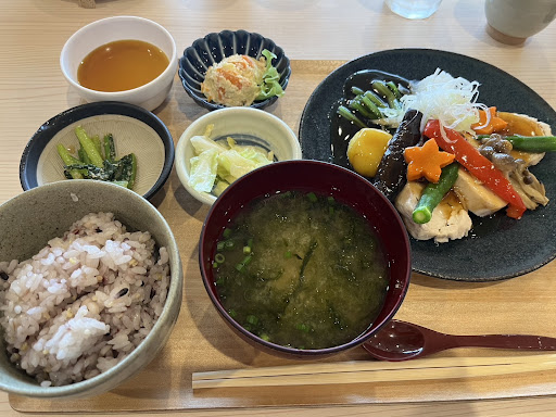 以前はビュッフェだったのでしょうか? 他の人の口コミに多く見かけました。 女性4人でしたが案内されたテーブル(4人掛け)にさらに「お荷物を置いたりして下さい」と2人掛けのテーブルをセッティングしてくれました。(店内がそれほど混んでいなかったのもあると思います) 地元の旬にこだわった食材を使ったお料理ということで[鶏むね肉のしっとり野菜巻きあんかけ御膳】をチョイス。雑穀ごはんと白米、少なめ、多めで選べます。季節のおばんざい2種、お味噌汁、香の物、デザートまで付いてこのお値段で大変満足な食事ができました。 他の人は 【やまゆりパークと旬野菜のせいろ蒸し御膳】 【焼き野菜のそうめん味噌ソース】 を注文しましたがどのメニューも身体によさそうなものばかりでした。 スタッフの方も明るく親...