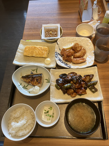 さてさて着席 お水もセルフ 漬物を食べて待っているとサイドメニューから到着。 卵焼きは初めてきた時に感動したのでまた注文 今回もとろとろじゅわーでとっても美味しい ふるふるっとつやつやっとした卵焼きこれは最高 しかも250円このご時世ではコスパ最強ですね 単品おかずはそんなにない中唐揚げは勇逸ボリュームある単品おかず。カリッと上がった唐揚げ中はジューシーでいわゆるthe唐揚げ という感じ。 ナス味噌の味付けもよく甘さと味噌のコクがたまらないです ご飯ももりもり進みますね 鯖は特に脂のった感じではないですが定食にちょこっとついてるにはいいですね これで千円いかないですから。 味噌汁も飲み放題だったら最高【わがまま】 追加で卵焼きを買いに行くと例の女性の年配の方が悩んでいる様子 お姉ちゃん教えて!!っと声をかけられてしまったので 私もあまりこないので!わからないですが!汗と言いながらなんとか食券を購入。【あまり知らなくてごめんなさい もっとちゃんとテキパキ教えられたらよかった…】 テキパキ教えられなかったにも関わらず感謝されしまい申し訳ない でもすごく仲の良さそうな二人組でよくいる"優しいおばちゃん"という感じで素敵な出会いでした。 そして隣に着席笑 ちょっとお話ししながら食事をして お先に失礼しますと店を出ました