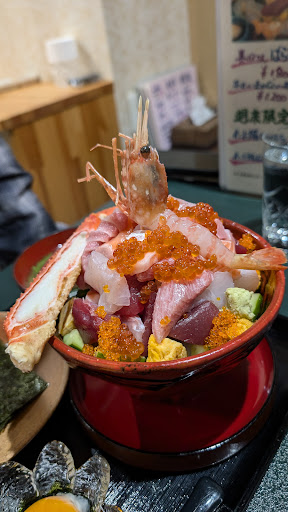 Read moreランチ11時オープン。 11:10に訪問しました。 昔、ラーメンエビスケがあった所の奥かな? 店の前に斜めに止めるタイプの駐車場と少し離れた所にも🅿️あるそうです。 店内に入るとカウンター4席。 テーブル席(靴を脱いで上がるタイプ)は満席に近く、カウンターにお邪魔しました。 テレビ有り📺️ 日替り海鮮丼の松¥1800円(税込)を注文しました。 松竹梅あります。 マグロ、イカ、ホタテ、鯛?平目?ネギトロ、ワカメ、ガリ、卵黄がご飯に美しく乗ってます。切り身大きいです。 ワサビもちゃんとしてる。 小鉢としじみ汁、デザートがついてます。 着丼まで1時間かかりましたが、友達と話をしていればあっという間です☺️ とはいえ、普段からワンオペなんでしょうか? 案内、調理、配膳、片付けそりゃー1時間待ちますわな😅 でも、仕事が丁寧なんでしょうね。 注文もらってから、刺身切ったりしてるんでしょう。 素晴らしい海鮮丼でした🐟️ 隣のお姉様は、¥2600円の八甲田を注文してました。それはそれは映える素敵✨な海鮮丼でしたよ☺️ ご飯が足りない場合...