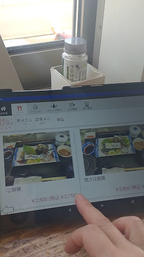 早速タッチパネルで関アジ御膳を注文。 調理に時間がかかるのでご了承くださいとの但し書きがあるので、ひたすら着座したまま待つこと1時間。 後から来た両隣の客は食べ終えて帰っている。