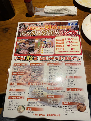 年末12/29に急遽帰省した友人夫婦と外食するのに適当なお店を探していましたが、伺う前日に探した為何処も予約が空いておらず、街中から離れたこちらがまだ予約出来た為伺いました。 食べ飲み放題に関してクチコミの評価が低かった為、やや不安はありましたが伺った時間が早く、まだ混んでいなかった為かスムーズに食べ飲み放題を満喫する事が出来ました。 味も特に気にはなりませんでしたが、他の方も書かれている通り焼き鳥が1本ずつのメニューしかなく、1人が一度に頼める食べ物が3品までの為、鶏がウリにも関わらず焼き鳥を満喫とはいかなかったのがマイナスポイントです。 私達の退店時間近くにお店が満席になり、その時は頼んだ物が出てくるのが遅くなる事もありましたが、状況を見れば致し方なしと感じる程度でした。 一番マイナスポイントなのは店舗責任者かそれに近い立場と思われる男性スタッフがその混み始めた時間帯に店外の喫煙場所でタバコを吸っていた事。物を出すのが遅くなり女性スタッフが『すいません!』と言いながら走り回っている時にその空気の読めなさは接客業に携わる者としては容認出来ないポイントでした。 とはいえ女性スタッフの皆さんは急に忙しくなった時間帯にも良く頑張られていたと思います。色々と鑑みた結果、平均的なお...