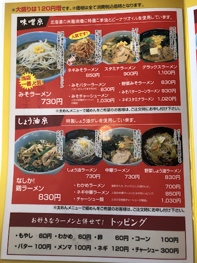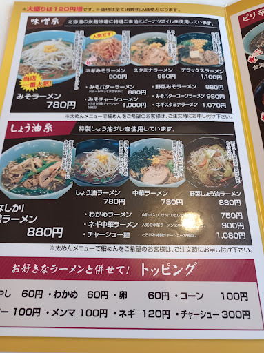 主に夕方以降によく利用しています。 夜間のおじちゃんおばちゃんがとにかくいつも明るく優しく気さくでほっとさせてくれるので、小さな子ども連れでも安心して行けます🙂 駐車場も店内もまぁまぁ広いし、バイパス沿いでアクセスもしやすい。 味は時々で気持ちスープが薄いような?!麺が若干茹で気味!?かな?という時が極稀にありますが😅 自分の中では許容範囲です。 どんなに味良くて人気でも対応が悪い店には自分は行く気ないので。 卵入り!?の太縮れ麺でモチモチしててスープよく絡むし、個人的には豚骨ラーメン系の細麺よりは好きです🎶 味噌、塩、醤油、一応豚骨も、と一通りのスープがあるので、 札幌系の太縮れ麺が好きな人なら色々楽しめると思います。 人気はやっぱり?味噌みたいですが、塩バターも人気です。 個人的には醤油も悪くないと思いますが、やはりついつい味噌か塩バター見ると食べたくなるかも(笑) あまり目立たず知らない人も多いんですが、個人的には1〜2を争うくらい好きなのがカレーラーメンです!カレーうどんのスープでもなく、カレーライスのルーでもなく、、スパイシーでトロッとしたスープにシャキシャキのもやしとコーンと縮れ麺の色んな食感がGOOD👍 大好きでいつも散々迷ってこれにしてしまう(笑) たまに本来ネギ味噌ラーメンの上に載っている辛ネギを別でトッピング頼んで更に辛くして食べたり、コーンやもやしのトッピングを頼んだり、、等など楽しんでます。 カレー気になりつつ頼んだことがない方、是非一度チャレンジしてみて下さい。 ...