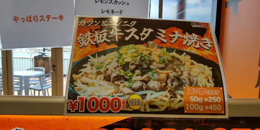 (ง •̀ω•́)ง❇️200gステーキ+サラダ+スープ+白ごはんor黒米(大盛り無料)で ★税込み1000円は安い!!★ とにかく肉食べたかったので、200g赤身にしましたが、柔らかい♪(動画→) ソースも色々あって悩みましたが、自分好みは、きざみニンニク+コショウ+塩が一番肉肉しかった。ご飯をそのまま食べるのも良いですが、肉汁をからめつつ鉄板の上で、ご飯+きざみニンニク+塩+コショウを混ぜ混ぜ→少しパリっとおこげを作りつつ食べるのがGOOD☆でした。 自分は量!!でしたが、お好みでミスジやロースなど色々ありますのでメニューを見て(写真)決めて行くのが良いかも?(購入は、発券機です)追い肉も可能なので、お腹と相談しながら堪能してみて下さい。すぐそばには、室内広場(遊具あり)もあるので、ママさんパパさんもゆっくり...