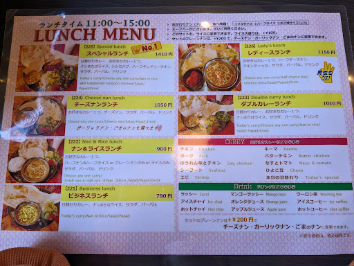 Read more大分市内から東郵便局を右手にそのまま直進、橋を渡って5分も掛からない内に右手に見えます。 駐車場は10台程。店内はカウンター席は無く、テーブル席だけでした。 料理は品数に比べて価格が良心的でかなりお得感があります。今回1260円のスペシャルランチにしましたが、これで他店なら2000円は超えると思いました。 味は勿論満足。夫はココイチなら1〜2辛でこちらで3辛にしてみた所、5位でも良さそうとの事でした。 私はココイチでは辛さ普通、こちらでは2辛で丁度良かったです。 他店インドカレーだと日替わりをメインのランチですが、ランチの選べるメニューが豊富なので、他店よりはオーダーから到着まで時間が掛るので覚悟した方が良いです。又、セルフのスープがまた色んな出汁の風味で、ニンニクとブラックペッパーが効いていてとても好みです。胡椒が効いたものが苦...