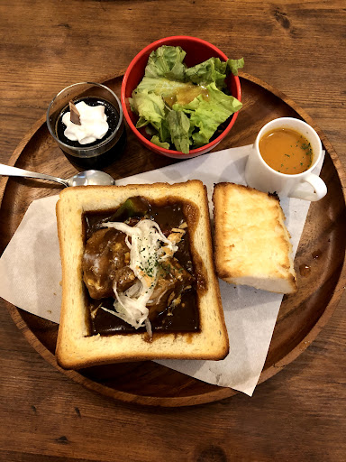 ソースの酸味が効いていて、塩気も強い。濃すぎで、メニューに書かれているようなさっぱり感はない。中は白ご飯に、何か青海苔のような味のハーブがちらほら。ソースをかけると塩辛すぎて、調整が難しい。ちょうどよくかけても、個人的にはそんなに合う味とは思わなかった。 あと、全体的に食べづらい。フォークの枝が細く米がすくえず、チキンがカットされていないため、フォーク、ナイフとスプーンを持ち替えて食べなくてはならず、面倒臭い。カトラリーの重心が柄の方にあるため、皿から落ちる。金属プレートだから、あまり奥に置くと熱くなりそう。 卵の半熟具合は最初は良かったが、ステーキに隠れた部分が後に残り、堅い卵焼きに...