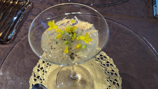 生ビールとスパークリングワインで乾杯!カクテルグラスにカレー風味の2層になったおしゃれなアミューズ。スパイシーで甘味があり、エディプルフラワーぼ苦味がアクセントです。