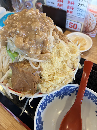 駐車場はぼちぼちある けど客が意外と多いからちょっと狭いかも? 注文は券売機 なので現金のみ まあそこは店それぞれ仕方がない 今回初めての訪問で一番困ったのは卓上にニンニクがなかったこと おかしい、色々事前に調べた時にはあったのに… 色々調べるまもなく二郎系ラーメンの野菜とかの量を聞かれたのでしょうがなく