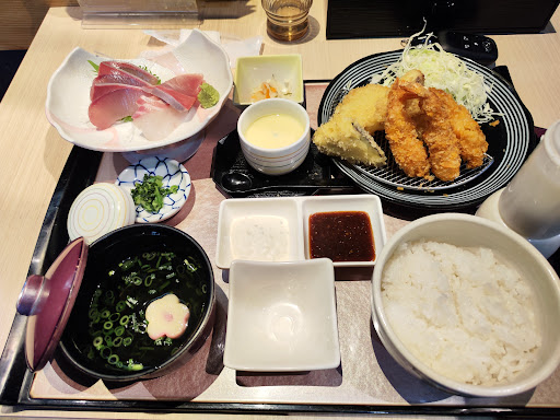 近くの和食処なので気になって入店。 閉店前だったからか刺身料理がなかったので天ぷら御膳とカレイの煮付けを注文。 天麩羅は普通、煮付けは味が染みてて美味しかったです。 帰りは料理の提供数が少ないからか海鮮ちゃんぽん10%offの商品券をくれました。 刺身を食べてみたいと思い、魚が好きなので魚々庵御膳を頼みたかったですが出来ないとの事で、フライ御膳刺身付きと煮付けを注文。 この日も同じカレイの煮付けを頼みましたが、少し煮詰め方があっさりでした。 フライがエビフライ冷凍でお子様料理かと思い残念。鯛の刺身をフライにした物、玉ねぎ、ナスフライでした。 値段と内容を考えると工夫がないのが残念な所。推しは海鮮丼なのかなと。 個人的に量を食べるので色々食べたみたいと2500円位目安で注文しましたが普通です。 夕方オープンすぐでメニューに出来ない物があるなら、紙に書いて外に貼り出してくれると助かります。工夫や改善がある事を祈ります。