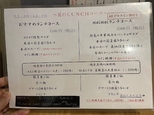 Read more平日のランチでうかがいました。12時ちょうどくらいだったのですが、先客が二組?私たちの後にも次々にお客さんが。人気です。 連れと二人とも夏のおすすめランチコースにしました。メインは酢豚と油淋鶏をそれぞれ選びました。 内容はメニューと写真を見てもらうとして、全体的に優しい味です。オシャレです。自然派ということでしょう(笑) 脂ぎった50代・男性には少し物足りない感じ(笑) 量も少なく感じました。ご飯のおかわりが無料だったので、おかわりを1回してちょうどいいくらい。 女性だと充...
