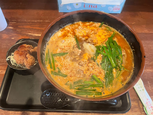 ランチタイムにて、利用いたしました。 まず店内に入ると、とんこつ?のガラ?みたいなのが鼻をツーンと刺激してきます。結構キツイです。 私は辛麺の3辛のちぢれ麺を食べました。 辛さは程よい感じでしたが、スープが無味に近い味で、味わいを感じれませんでした。 溶き卵と挽き肉の量はわりと多めでした。